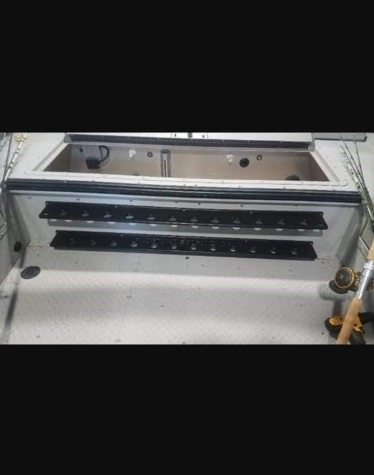 Straight run rod racks are the perfect solution for rod storage.. We offer a 6, 8, 10 and 12 rod version. These are designed to fit perfectly along the back or front wall, of most boats. Designed to clear the lip on most SeaArk boats livewells.  Comes in two handy sections allowing you to mount it as you see fit. Rod holes are 1.5” in diameter and spaced 4 inches apart. 2 color options to choose from.