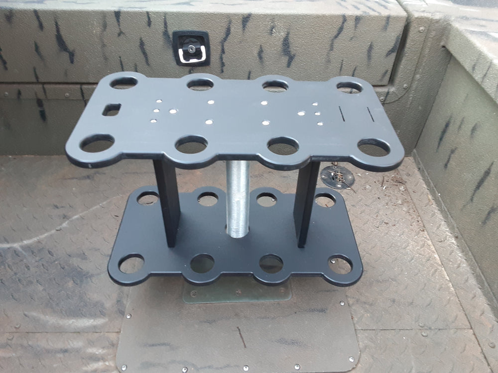 The ultimate stress-free fishing Seat Post Rod Rack! Keep your rods and reels neatly organized and out of harm's way while protecting your investment. This incredible, spacious rack boast a 1.5" diameter hole to hold 8 rods with reels! The XL unit boasts more spacing between rod holes than our standard units– 4.5" on-center! Great for catfish rods and reels as well as inshore saltwater rods and reels.  It also includes a custom aluminum mount to fit most seat post, plus a knife slot and pliers hole for added convenience.  The rack measures 20" long x 10" wide x 10" high. To top it off, our racks are constructed from rugged 1/2" thick starboard marine-grade plastic!
