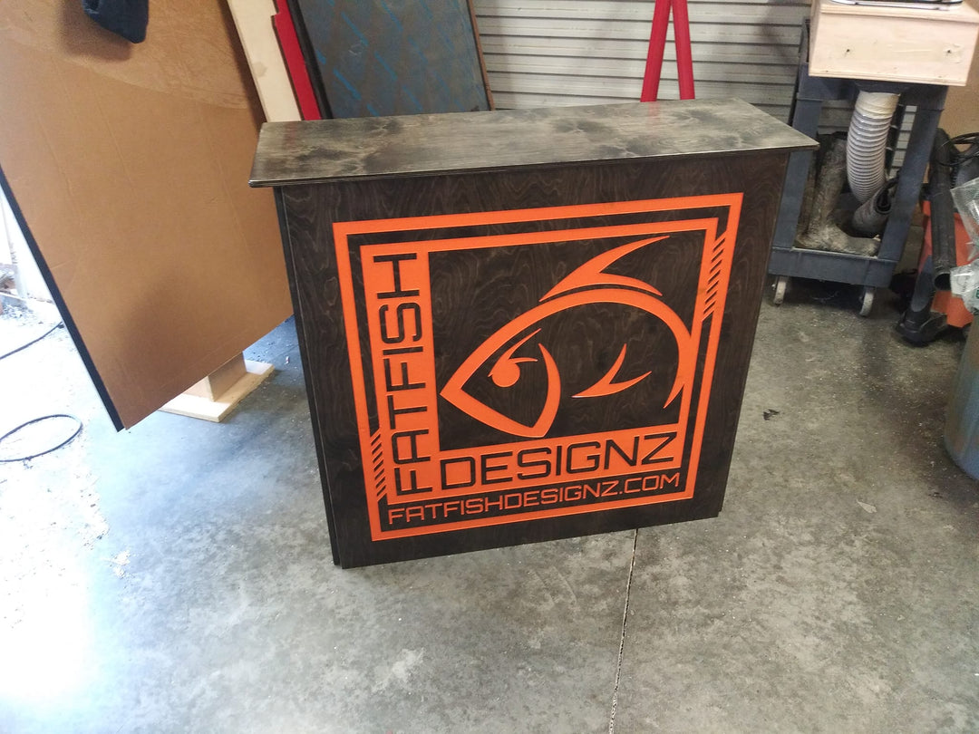 My personal wood checkout station i use for trade shows and events. The logo is engraved and painted on stained wood.