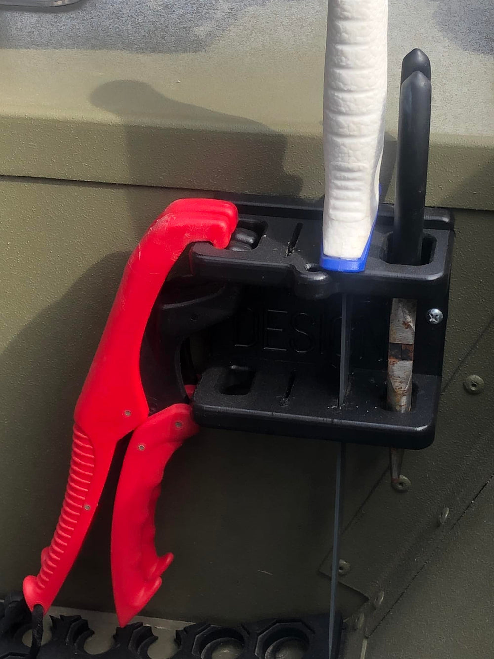 Fishing tool holder -small, expertly crafted from durable 1/2" marine grade starboard plastic. With the capacity to hold 2 knives and 2 pliers, this versatile tool holder comes in 5 color options and can easily attach to any flat surface or  our track bracket. (sold separately) Say goodbye to rot, fading, and splintering with this essential fishing and boating accessory! Keep your tool secure and in reach at all times. unit measures 4 wide x 4 tall x2.5 deep.